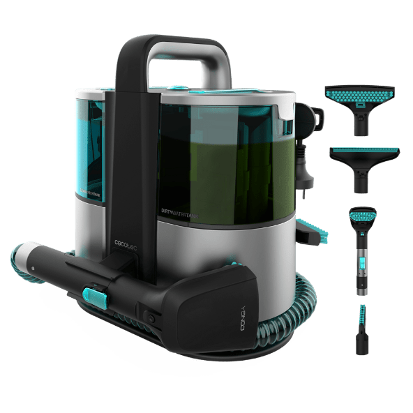 600 W. 14 kPa. Dos depósitos: agua limpia (1.500 ml) y agua sucia (850 ml). Incluye un accesorio de ventanas y 3 boquillas para eliminar la suciedad de forma eficaz.